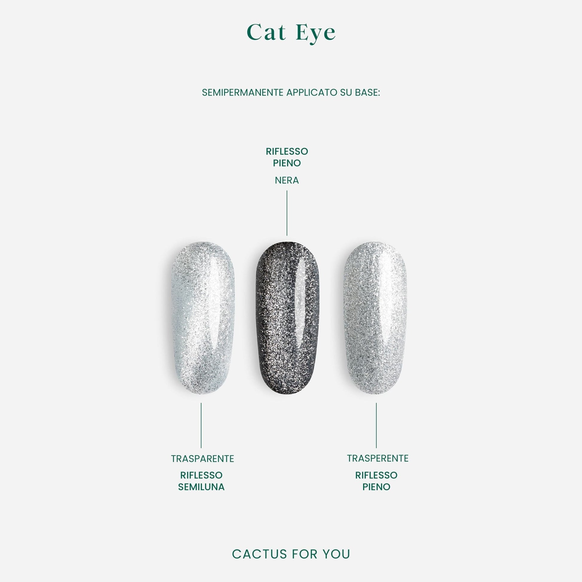 Lasciati conquistare dal fascino magnetico dei nuovi semipermanenti firmati Cactus for You: una pioggia di glitter che se abbinata all’uso dell’apposito magnete rivela un luminoso effetto Cat Eyes. Estremamente luminosi e ricchi di riflessi, questi gel polish rivelano giochi di luce che valorizzano ogni tipo di look, dalle basi nude agli abbinamenti tono su tono, fino ai fondi più scuri.
